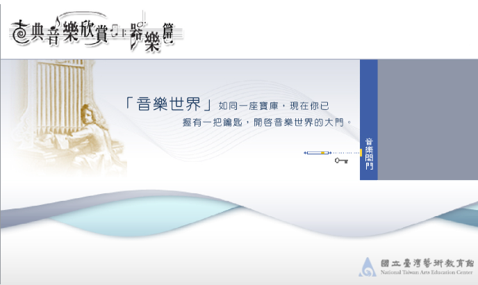 ■聲音的世界:從身邊熟悉的聲音開始,回頭看看東西文化對聲音科學化分類的方式,到不同語這對音樂風格種類的影響,建立理解聲音世界的基本架構。 ■器樂家族:呈現西歐古典音樂四大器樂家族(鍵盤、小提琴家族、管樂與打擊樂),自1600年左右發展至今的形貌與聲音。 ■音樂語法:導說音樂術語、音樂時間的度量衡、音樂句法的形成等,並引用精典樂曲剖析樂曲中音量的變化及具有故事性的主題音樂。 ■三百年來的各家各派:概略介紹西歐古典音樂四個發展階段的主要樂派和音樂家,並收錄每位作曲家的代表樂曲以供聆聽。 ■遊戲天地:包括三項遊戲:「聽曲猜猜看」以本光碟的內容設計益智題目;「小青蛙過音樂河」以遊戲方式,帶您認識音符與節拍的關係;「動物森林音樂家」將大小調與和弦的關係融入遊戲中,作為自我學習成果的測驗。